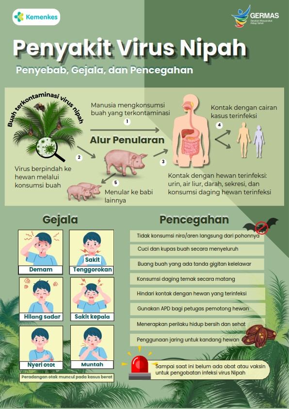 Gejala awal infeksi Virus Nipah umumnya meliputi demam, sakit kepala, nyeri otot, muntah, dan gangguan pernapasan. Dalam kondisi tertentu, penyakit ini dapat berkembang menjadi gangguan saraf serius seperti penurunan kesadaran hingga ensefalitis (radang otak).